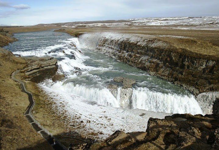 Gullfoss is actually two separate waterfalls, the upper one has a drop of 11 metres and the lower one 21 metres. The rock of the river bed was formed during an interglacial period.
