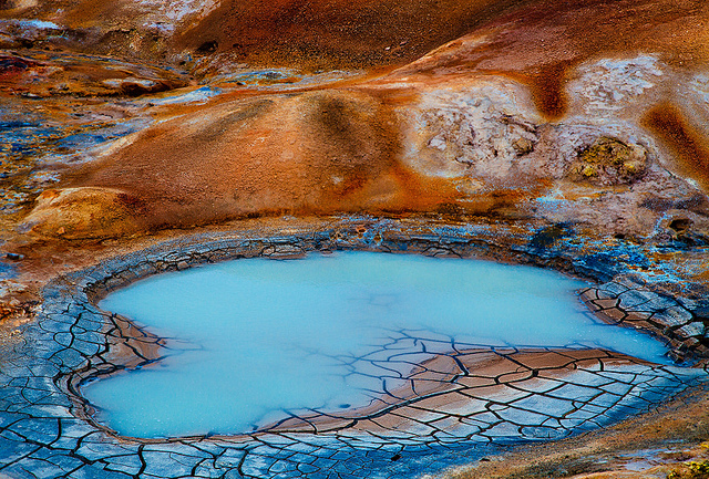 Visit the geothermal area Hverir by Námaskarð. High temperature area where you find steaming fumaroles and bubbling mudpools. Watch out it ́s boiling hot!